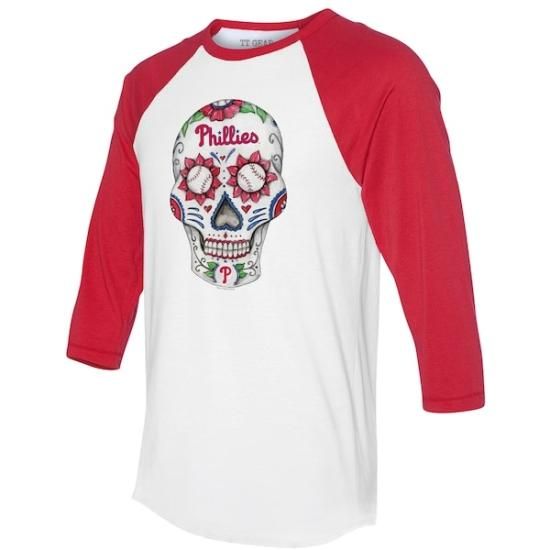 商品説明 フィラデルフィア・フィリーズ タイニー ターニプ ユニセックス Sugar Skull 3/4-スリーブ ラグラン Tシャツ - ホワイト/レッドは、メジャーリーグ公認のMLBグッズです。