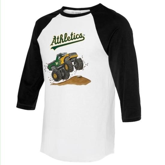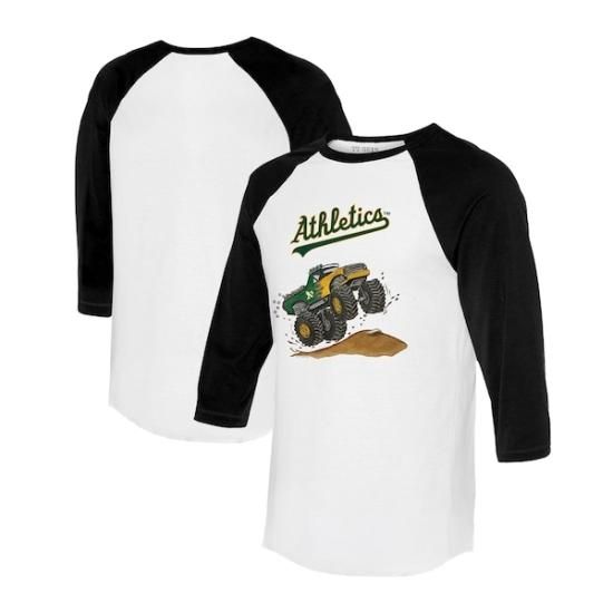アスレチックス タイニー ターニプ ユニセックス モンスター トラック 3/4-スリーブ ラグラン Tシャツ - ホワイト/ブラックは、メジャーリーグ公認のMLBグッズです。