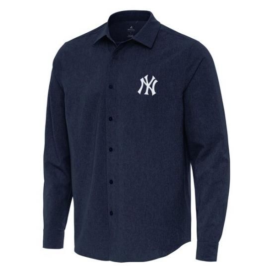 ニューヨーク・ヤンキース アンティグア Exposure ロングスリーブ ボタン-アップ シャツ - ネイビーは、メジャーリーグ公認のMLBグッズです。