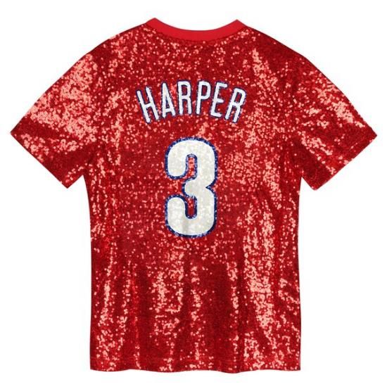 ブライス・ハーパー フィラデルフィア・フィリーズ ジュニアs ネーム&ナンバー シークイン(衣服の装飾などに用いる光る金属片) Vネック トップ - レッドは、メジャーリーグ公認のMLBグッズです。