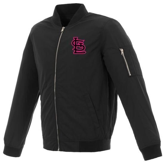 セントルイス・カージナルス JH デザイン レディース ナイロン Bomber ジャケット - ブラック/ピンクは、メジャーリーグ公認のMLBグッズです。