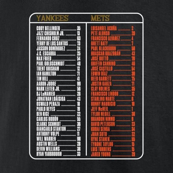 ニューヨーク・ヤンキース vs. ニューヨーク・メッツ ファナティクス 2025 サブウェイ シリーズ ロスター Tシャツ - ブラックは、メジャーリーグ公認のMLBグッズです。