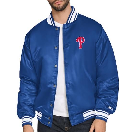 商品説明 フィラデルフィア・フィリーズ スターター プリント ロゴ ヴィーシティ フル-スナップ サテン ジャケット - ロイヤルは、メジャーリーグ公認のMLBグッズです。