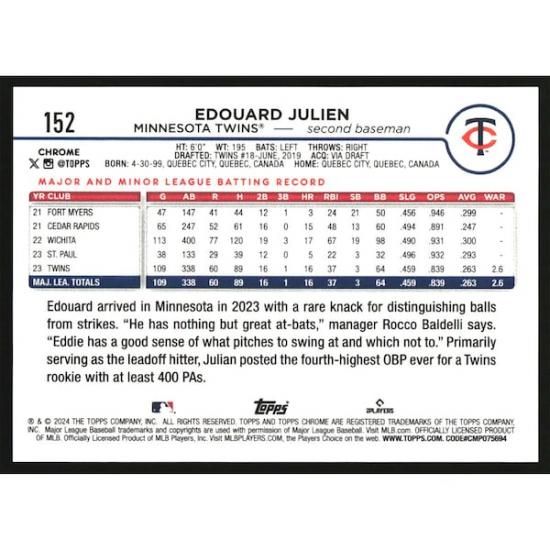 商品説明 2024 トッププレーヤー クローム ブラック Refracトゥーrs #152 Edouard Julien /10は、メジャーリーグ公認のMLBグッズです。