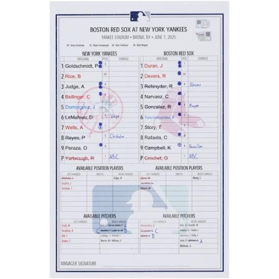 ニューヨーク・ヤンキース ファナティクス オーセンティック 実際の試合で使用された ラインアップ カード vs. ボストン・レッドソックス オン June 7, 2025は、メジャーリーグ公認のMLBグッズです。