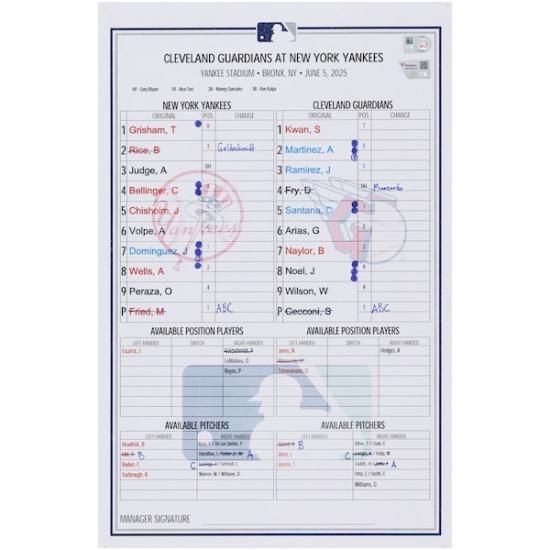 ニューヨーク・ヤンキース ファナティクス オーセンティック 実際の試合で使用された ラインアップ カード vs. クリーブランド・ガーディアンズ オン June 5, 2025は、メジャーリーグ公認のMLBグッズです。
