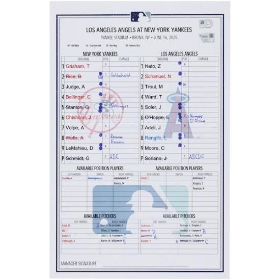 ニューヨーク・ヤンキース ファナティクス オーセンティック 実際の試合で使用された ラインアップ カード vs. ロサンゼルス・エンゼルス オン June 16, 2025は、メジャーリーグ公認のMLBグッズです。