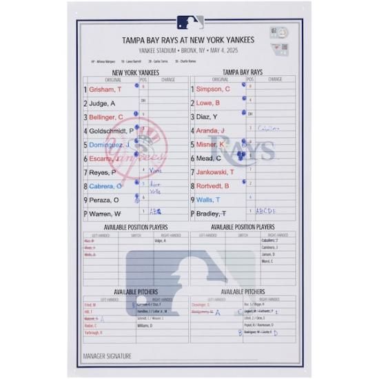 ニューヨーク・ヤンキース ファナティクス オーセンティック 実際の試合で使用された ラインアップ カード vs. タンパベイ・レイズ オン May 4, 2025 は、メジャーリーグ公認のMLBグッズです。
