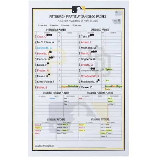 ピッツバーグ・パイレーツ ファナティクス オーセンティック 実際の試合で使用された ラインアップ カード vs. サンディエゴ・パドレス オン May 31, 2025は、メジャーリーグ公認のMLBグッズです。