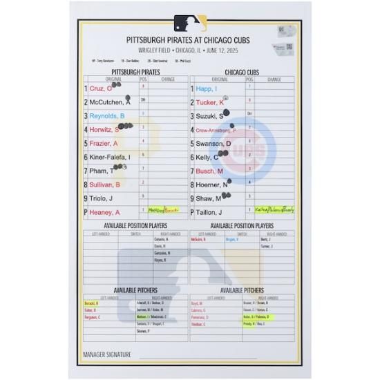 ピッツバーグ・パイレーツ ファナティクス オーセンティック 実際の試合で使用された ラインアップ カード vs. シカゴ・カブス オン June 12, 2025は、メジャーリーグ公認のMLBグッズです。