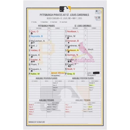 ピッツバーグ・パイレーツ ファナティクス オーセンティック 実際の試合で使用された ラインアップ カード vs. セントルイス・カージナルス オン May 7, 2025 は、メジャーリーグ公認のMLBグッズです。