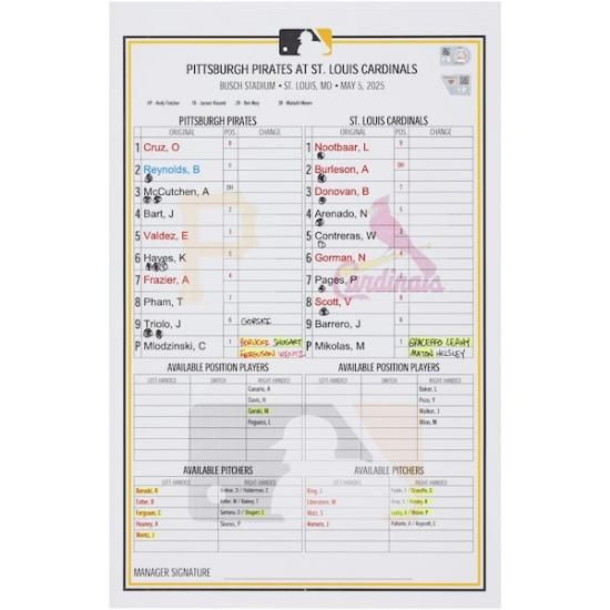 商品説明 ピッツバーグ・パイレーツ ファナティクス オーセンティック 実際の試合で使用された ラインアップ カード vs. セントルイス・カージナルス オン May 5, 2025 は、メジャーリーグ公認のMLBグッズです。