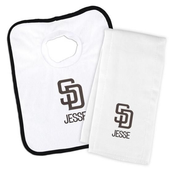 サンディエゴ・パドレス Chad & Jake キッズ パーソナライズ よだれかけ & バープ クロス セット - ホワイトは、メジャーリーグ公認のMLBグッズです。