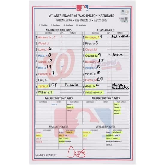 ワシントン・ナショナルズ ファナティクス オーセンティック 実際の試合で使用された ラインアップ カード vs. アトランタ・ブレーブス オン May 22, 2025は、メジャーリーグ公認のMLBグッズです。
