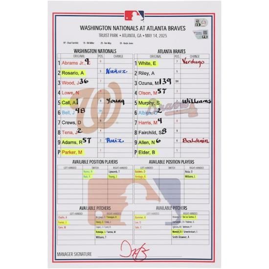 ワシントン・ナショナルズ ファナティクス オーセンティック 実際の試合で使用された ラインアップ カード vs. アトランタ・ブレーブス オン May 14, 2025は、メジャーリーグ公認のMLBグッズです。