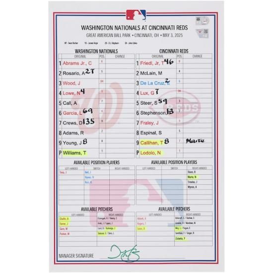 商品説明 ワシントン・ナショナルズ ファナティクス オーセンティック 実際の試合で使用された ラインアップ カード vs. シンシナティ・レッズ オン May 3, 2025 は、メジャーリーグ公認のMLBグッズです。