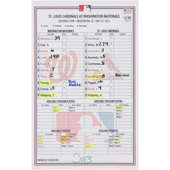 ワシントン・ナショナルズ ファナティクス オーセンティック 実際の試合で使用された ラインアップ カード vs. セントルイス・カージナルス オン May 10, 2025 は、メジャーリーグ公認のMLBグッズです。