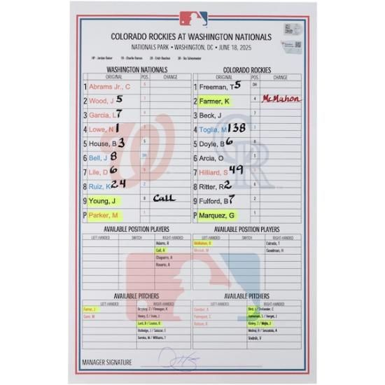 ワシントン・ナショナルズ ファナティクス オーセンティック 実際の試合で使用された ラインアップ カード vs. コロラド・ロッキーズ オン June 18, 2025は、メジャーリーグ公認のMLBグッズです。