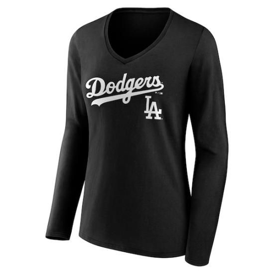 ロサンゼルス・ドジャース レディース チーム ロックup ロングスリーブ Vネック Tシャツ - ブラックは、メジャーリーグ公認のMLBグッズです。
