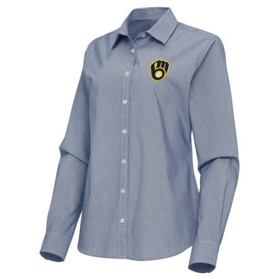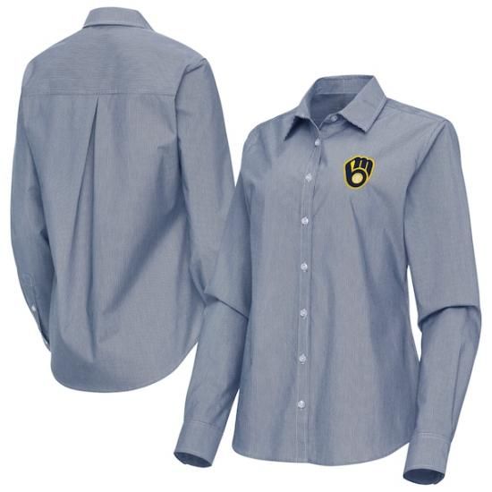 ミルウォーキー・ブルワーズ アンティグア レディース Porter Woven ロングスリーブ ボタン-アップ シャツ - ネイビーは、メジャーリーグ公認のMLBグッズです。