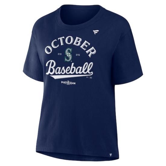 シアトル・マリナーズ レディース 2025 MLB ポストシーズン ロッカー ルーム Tシャツ - ネイビーは、メジャーリーグ公認のMLBグッズです。