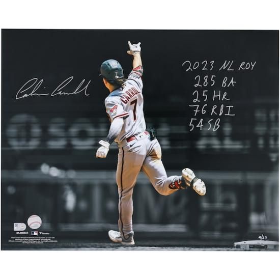 コービン・キャロル アリゾナ・ダイヤモンドバックス 直筆サイン入り ファナティクス オーセンティック 16" x 20" Pointing スポットライト フォトグラフ with 2023 NL ROY スタッツ インスクリプションs - 限定版 オブ 23は、メジャーリーグ公認のMLBグッズです。