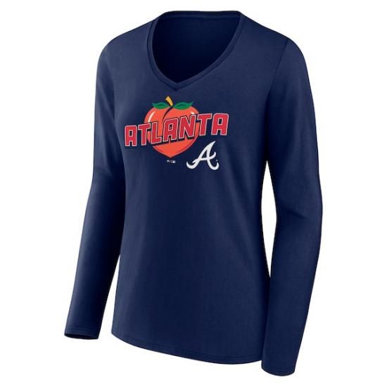 アトランタ・ブレーブス レディース Peach Vネック ロングスリーブ Tシャツ - ネイビーは、メジャーリーグ公認のMLBグッズです。