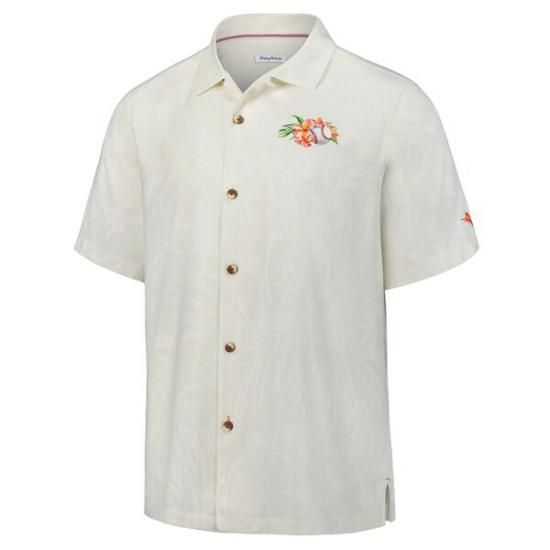 ブランド:Tommy Bahama インポートグッズ Traditional camp 襟 with small loop 裾のサイドスプリット adds freedom of movement タグ付き in 側面 seam Tonal 手のひら tree pattern throughアウト 刺繍付き, island-t裾ed グラフィック on 前面, back and left sleeve 素材:シルク100% ショートスリーブ ドライクリーニングのみ フルボタン(前面) 公式ライセンス