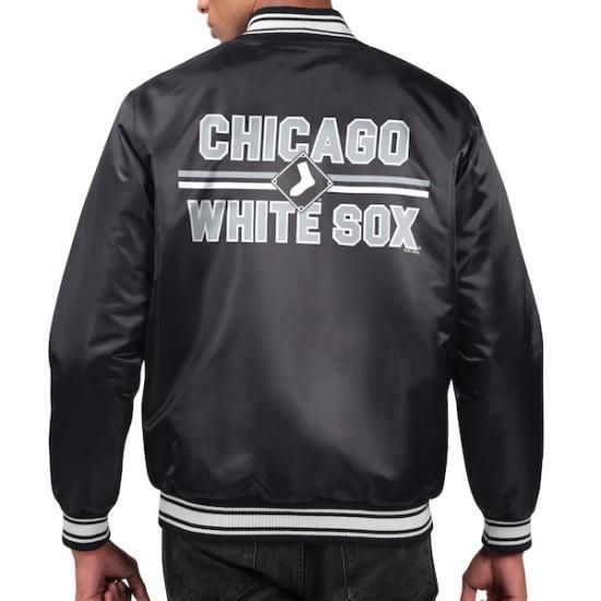 シカゴ・ホワイトソックス スターター プリント チーム ロゴ サテン ヴィーシティ フル-スナップ ジャケット - ブラックは、メジャーリーグ公認のMLBグッズです。