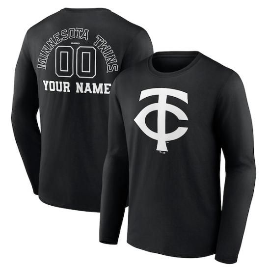ミネソタ・ツインズ Mオンochrome パーソナライズ ネーム&ナンバー ロングスリーブ Tシャツ - ブラックは、メジャーリーグ公認のMLBグッズです。
