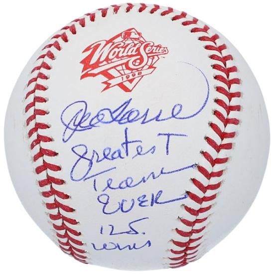 Joe トゥーrre ニューヨーク・ヤンキース ファナティクス オーセンティック 直筆サイン入り 1998 ワールド シリーズ ロゴ ベースボール with "グレーテスト チーム Ever 125 Wins" インスクリプションは、メジャーリーグ公認のMLBグッズです。