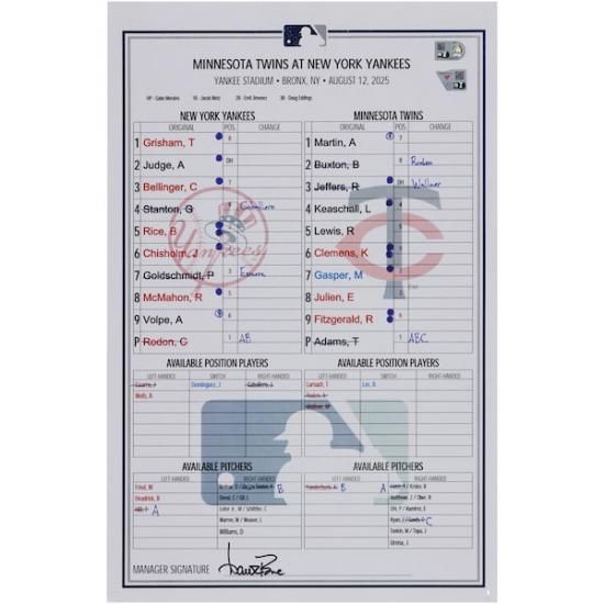 ニューヨーク・ヤンキース ファナティクス オーセンティック 実際の試合で使用された ラインアップ カード vs. ミネソタ・ツインズ オン August 12, 2025は、メジャーリーグ公認のMLBグッズです。