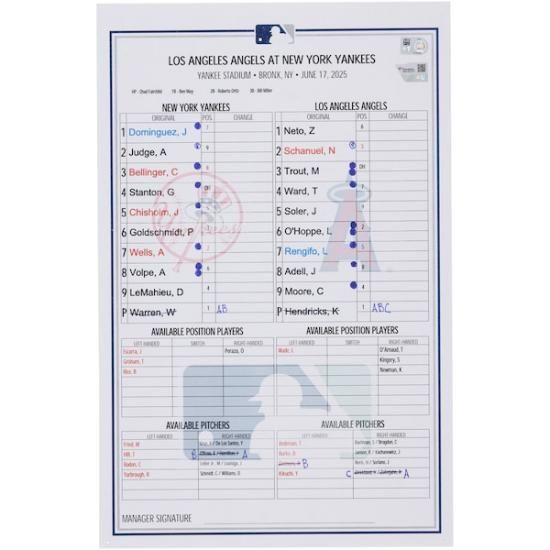 ニューヨーク・ヤンキース ファナティクス オーセンティック 実際の試合で使用された ラインアップ カード vs. ロサンゼルス・エンゼルス オン June 17, 2025は、メジャーリーグ公認のMLBグッズです。