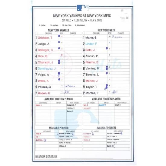 ニューヨーク・ヤンキース ファナティクス オーセンティック 実際の試合で使用された ラインアップ カード vs. ニューヨーク・メッツ オン July 5, 2025は、メジャーリーグ公認のMLBグッズです。