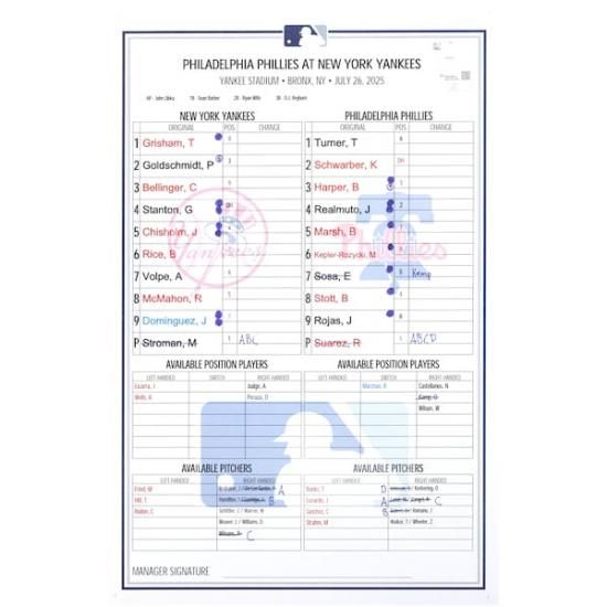 ニューヨーク・ヤンキース ファナティクス オーセンティック 実際の試合で使用された ラインアップ カード vs. フィラデルフィア・フィリーズ オン July 26, 2025は、メジャーリーグ公認のMLBグッズです。