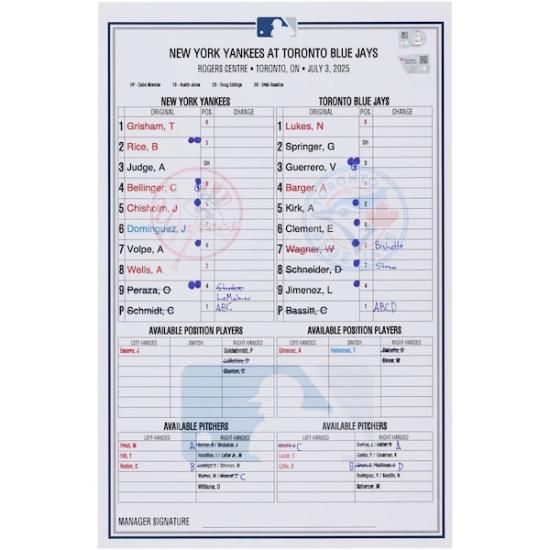 ニューヨーク・ヤンキース ファナティクス オーセンティック 実際の試合で使用された ラインアップ カード vs. トロント・ブルージェイズ オン July 3, 2025は、メジャーリーグ公認のMLBグッズです。