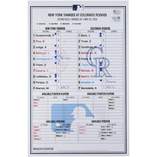 ニューヨーク・ヤンキース ファナティクス オーセンティック 実際の試合で使用された ラインアップ カード vs. コロラド・ロッキーズ オン May 25, 2025は、メジャーリーグ公認のMLBグッズです。