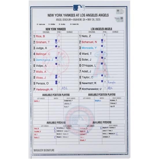 ニューヨーク・ヤンキース ファナティクス オーセンティック 実際の試合で使用された ラインアップ カード vs. ロサンゼルス・エンゼルス オン May 26, 2025は、メジャーリーグ公認のMLBグッズです。