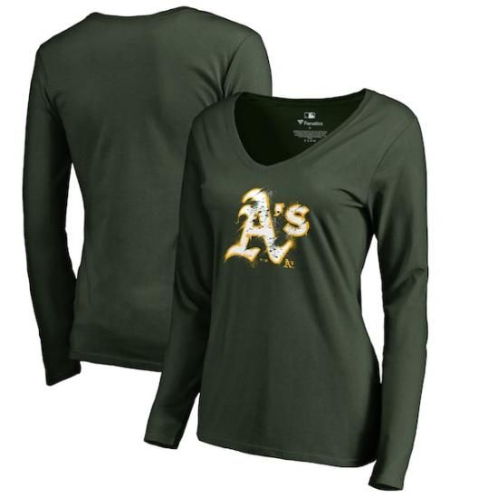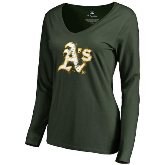 アスレチックス レディース スパラター ロゴ ロングスリーブ Vネック Tシャツ - グリーンは、メジャーリーグ公認のMLBグッズです。