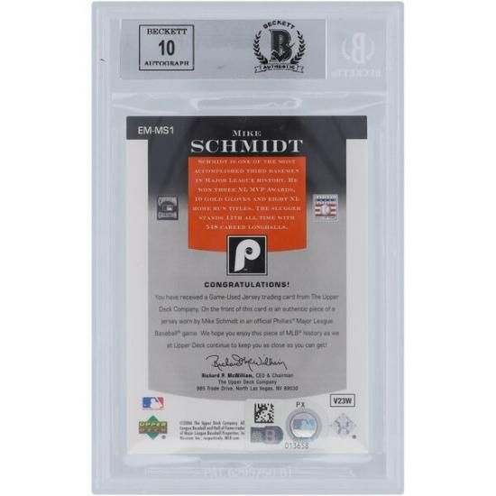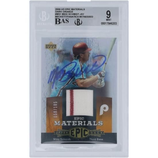 マイク・シュミット フィラデルフィア・フィリーズ 直筆サイン入り 2006 アッパーデッキ社 Epic マテリアルs Dark オレンジ デュアル-カラー ユニフォーム ピンストライプ Relic #EM-MS1 #/185 Beckett ファナティクス Witnessed オーセンティックアットed 9/10 カードは、メジャーリーグ公認のMLBグッズです。
