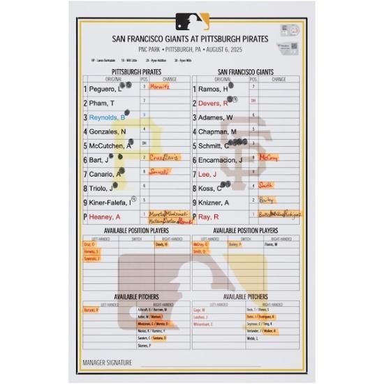 ピッツバーグ・パイレーツ ファナティクス オーセンティック 実際の試合で使用された ラインアップ カード vs. サンフランシスコ・ジャイアンツ オン August 6, 2025は、メジャーリーグ公認のMLBグッズです。