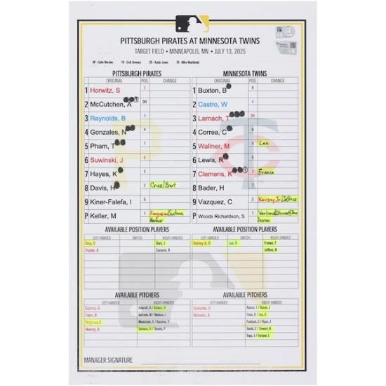 ピッツバーグ・パイレーツ ファナティクス オーセンティック 実際の試合で使用された ラインアップ カード vs. ミネソタ・ツインズ オン July 13, 2025は、メジャーリーグ公認のMLBグッズです。