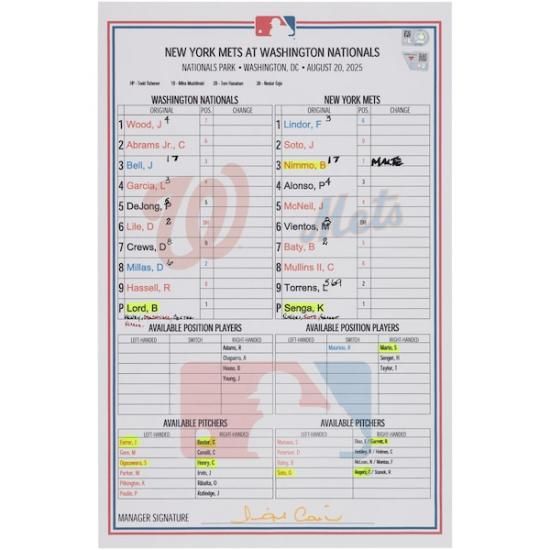ワシントン・ナショナルズ 直筆サイン入り ファナティクス オーセンティック 実際の試合で使用された ラインアップ カード vs. ニューヨーク・メッツ オン August 20, 2025は、メジャーリーグ公認のMLBグッズです。