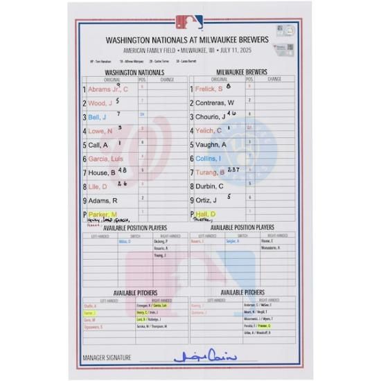 ワシントン・ナショナルズ ファナティクス オーセンティック 実際の試合で使用された ラインアップ カード vs. ミルウォーキー・ブルワーズ オン July 11, 2025は、メジャーリーグ公認のMLBグッズです。