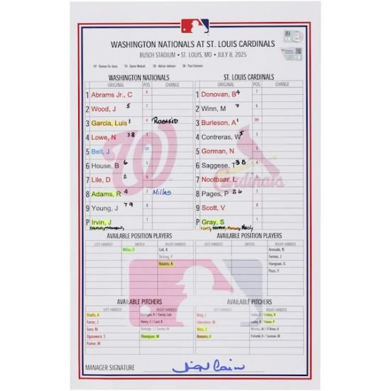 ワシントン・ナショナルズ ファナティクス オーセンティック 実際の試合で使用された ラインアップ カード vs. セントルイス・カージナルス オン July 8, 2025は、メジャーリーグ公認のMLBグッズです。
