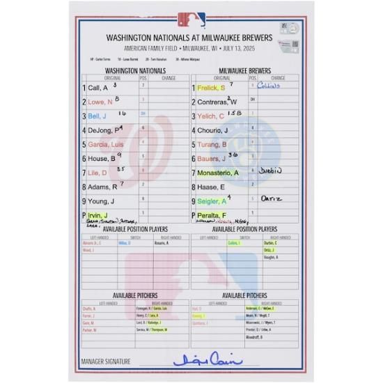 ワシントン・ナショナルズ ファナティクス オーセンティック 実際の試合で使用された ラインアップ カード vs. ミルウォーキー・ブルワーズ オン July 13, 2025は、メジャーリーグ公認のMLBグッズです。