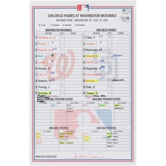 ワシントン・ナショナルズ ファナティクス オーセンティック 実際の試合で使用された ラインアップ カード vs. サンディエゴ・パドレス オン July 18, 2025は、メジャーリーグ公認のMLBグッズです。