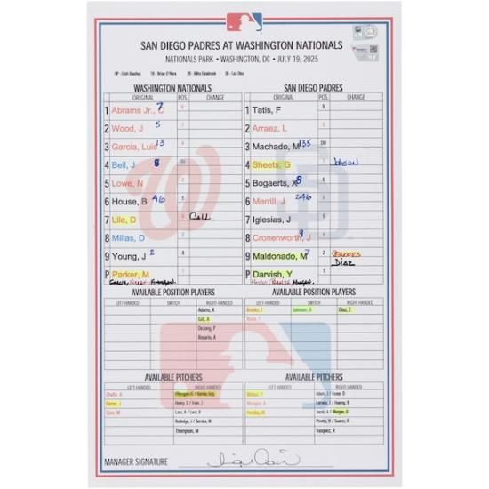 商品説明 ワシントン・ナショナルズ ファナティクス オーセンティック 実際の試合で使用された ラインアップ カード vs. サンディエゴ・パドレス オン July 19, 2025は、メジャーリーグ公認のMLBグッズです。