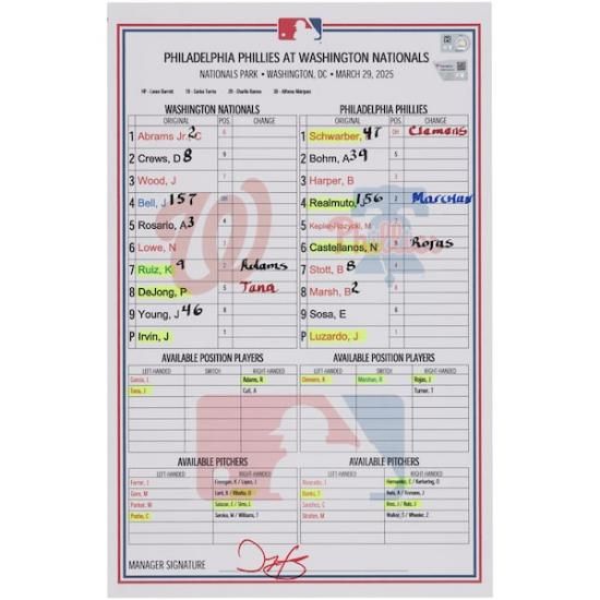 ワシントン・ナショナルズ ファナティクス オーセンティック 実際の試合で使用された ラインアップ カード vs. フィラデルフィア・フィリーズ オン March 29, 2025は、メジャーリーグ公認のMLBグッズです。