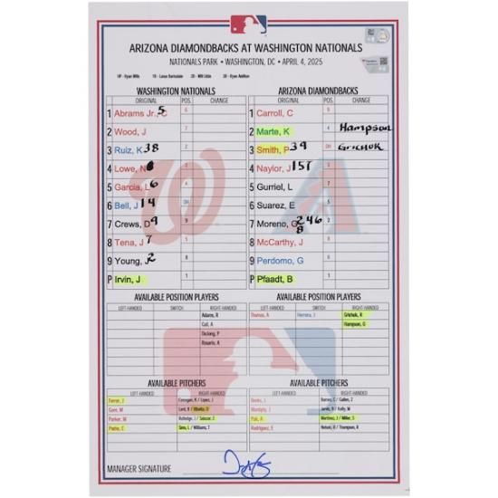 商品説明 ワシントン・ナショナルズ ファナティクス オーセンティック 実際の試合で使用された ラインアップ カード vs. アリゾナ・ダイヤモンドバックス オン April 4, 2025は、メジャーリーグ公認のMLBグッズです。